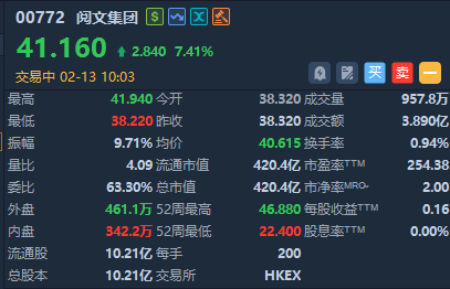 阅文集团逆势涨近8%,截至发稿,涨超7%,报41.16港元,成交额3.89亿港元。