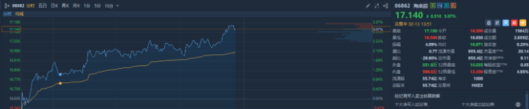 智通财经APP获悉,海底捞(06862)午后涨超3%,截至发稿,涨3.07%,报17.14港元,成交额2.48亿港元。