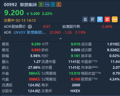 智通财经APP获悉,联想集团(00992)绩后涨近3%,截至发稿,涨2.22%,报9.2港元,成交额9.3亿港元。