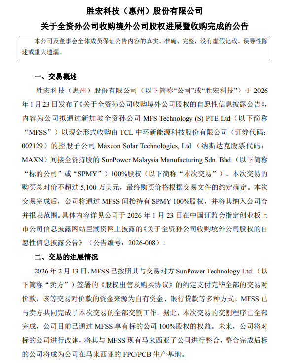 2月13日,胜宏科技(300476.SZ)公告,公司拟通过新加坡全资孙公司MFSS以现金形式收购由TCL中环新能源科技股份有限公司的控股子公司Maxeon Solar Technologies,Ltd.间接全资持股的SPMY100%股权。
