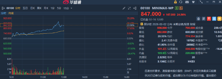 今日盘面上,科网股涨跌不一,阿里巴巴跌近1%,百度、网易涨超1%;半导体板块拉升,澜起科技涨超14%;有色金属板块强势,洛阳钼业涨超5%;AI应用股活跃,Minimax涨25%;中资券商股高开低走,国联民生跌超6%。