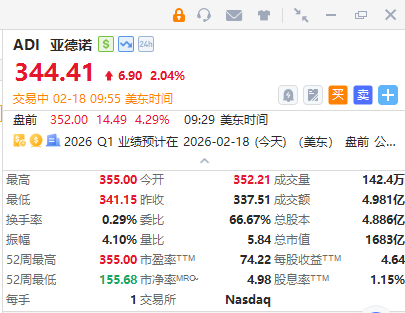 华盛资讯2月18日讯,半导体制造商亚德诺涨超2%,26财年Q1营收31.60亿美元,同比增长30%;