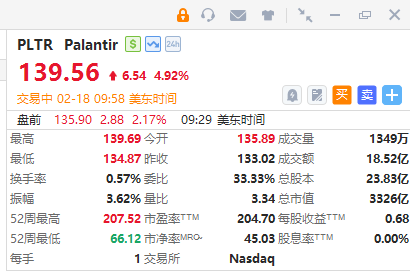 Palantir涨超4%!瑞穗证券将其评级上调至跑赢大盘,目标价195美元。