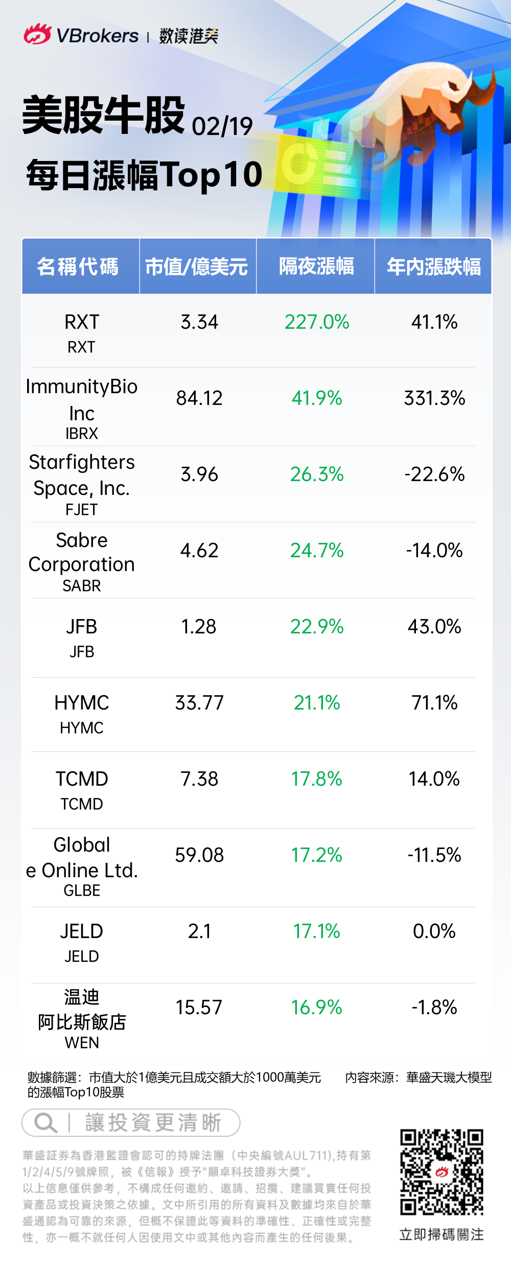 發仔梳理了每日美股涨幅Top10榜单,供投资者参考。以下为隔夜美股涨幅靠前的个股: