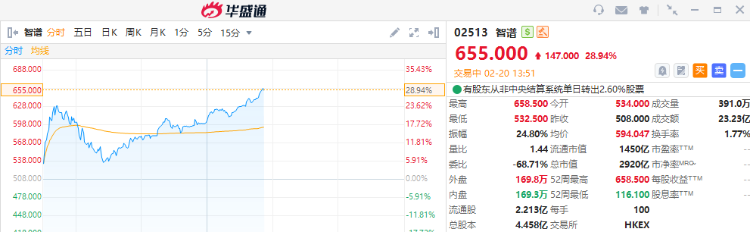 智谱股价再度走高,截至发稿,涨近30%,报655港元,成交额23.23亿港元。