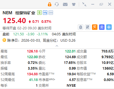 全球最大黄金生产商纽蒙特矿业盘前跌超3%,2025财年Q4净利润13亿美元,同比减少7.3%;
