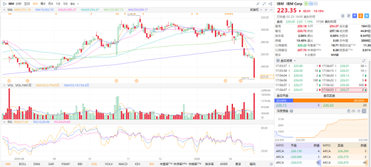 IBM跌超13%,创2000年以来最大跌幅。