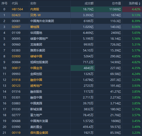 内房股、建材水泥股涨幅居前,截至发稿,贝壳-W涨超9%,碧桂园涨超8%,华润置地涨超5%,中国金茂、绿城中国、龙湖集团均涨近5%,越秀地产、融创中国均涨近4%,万科企业涨超2%。海螺水泥涨近7%,中国建材涨超1%。