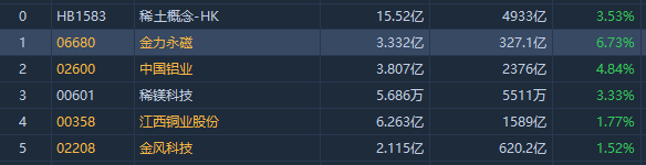 稀土概念午后持续走强,金力永磁涨超6%,中国铝业涨近5%,江西铜业股份、金风科技涨超1%。