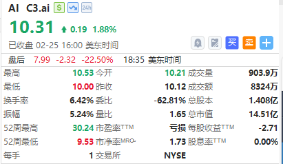 华盛资讯2月26日讯,C3.ai公布2026财年Q3业绩,公司Q3营收0.53亿美元,同比下降46.5%,归母净利润亏损1.33亿美元,同比亏损扩大66.3%。盘后暴跌22%。