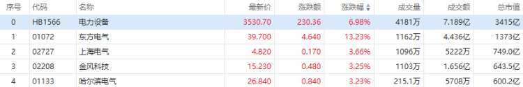 港股电力设备概念股集体走高!东方电气涨超13%,上海电气、金风科技、哈尔滨电气均涨超3%。