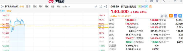 长飞光纤光缆涨近7%,高见145港元再度刷新历史新高,年初至今股价累计飙升逾1.7倍。截至发稿,报140.4港元,成交额20.98亿港元。