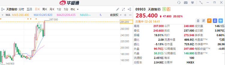 天数智芯涨超20%,高见287港元刷新上市新高。截至发稿,涨20.02%,报285.4港元,成交额3.997亿港元。