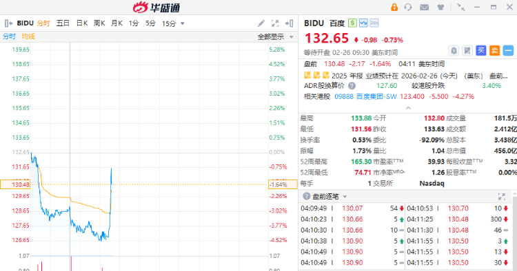 中概股集体下挫,阿里巴巴、京东盘前跌超3%;百度发布财报,股价跌势迅速缩窄至1%,此前一度跌超3%,公司宣布50亿美元回购计划。