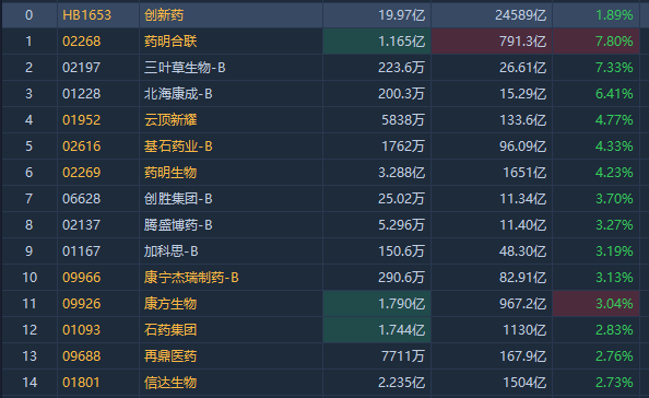 港股创新药概念股盘初拉升,药明合联涨超7%,云顶新耀、药明生物涨超4%,康方生物涨超3%、再鼎医药、石药集团、信达生物涨超2%。