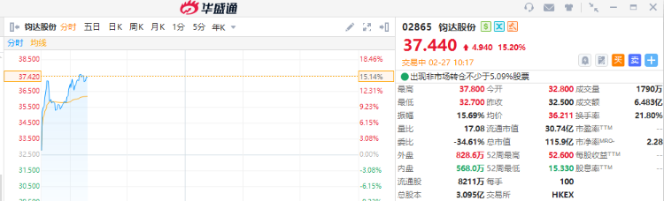 截至发稿,钧达股份涨超15%,报37.44港元,成交额6.483亿港元。