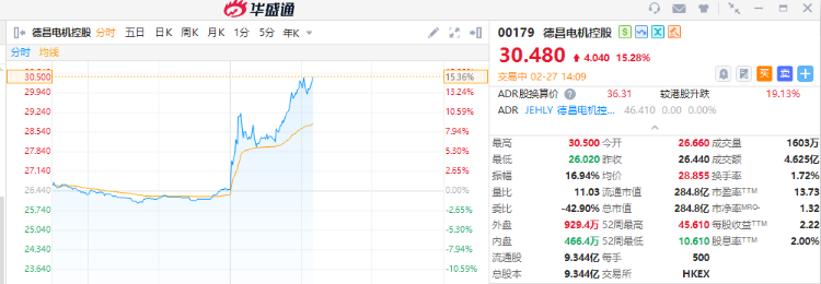德昌电机控股(00179)午后涨超15%,截至发稿,报30.48港元,成交额4.625亿港元。