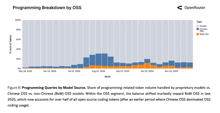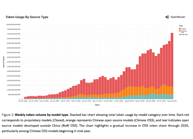 图:从2024年11月到2025年11月的周度Token总量堆叠柱状图。深红色=闭源模型,橙色=中国开源模型,蓝绿色=其他地区开源模型。能清晰看到中国开源模型(橙色)从几乎不可见到逐渐占到近30%的过程。