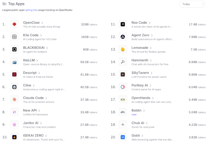 图:OpenClaw是OpenRouter最大的单一应用,其Token消耗量约占平台显著比例