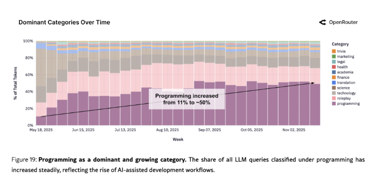 图:编程类请求在所有LLM查询中的占比,从2025年初约11%持续攀升至50%以上