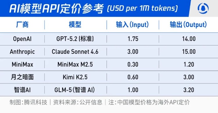 Claude 4.6 Sonnet 的输出价格为 15 美元 / 百万 Token,而 MiniMax M2.5 的典型输出价格约为 1.2 美元 / 百万 Token,前者是后者的约 12.5 倍。GPT-5.2 的输出价格为 14 美元 / 百万 Token,也接近 MiniMax 的 11.7 倍。即便是已经涨价的智谱 GLM-5,输出价格约为 3.2 美元 / 百万 Token,仍然只有 Claude 的大约五分之一左右。