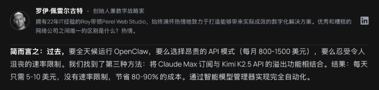 一家使用OpenClaw的欧洲开发工作室公开了他们的方案:80%的日常推理引擎用Kimi K2.5,碰到高难度推理、复杂系统架构之类的20%硬骨头,通过bash命令把任务甩给Claude。一天的Kimi开销大约5到10美元,月度Token预算控制在150到300美元。如果同样的事全量用ClaudeAPI模式,月成本将高达800-1500美元以上。