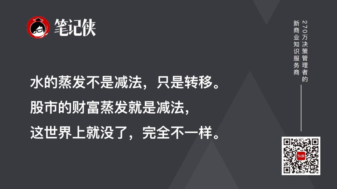 注意,财富蒸发和水的蒸发不一样,有本质区别:水的蒸发不是减法,只是转移;股市的财富蒸发就是减法,这世界上就没了,完全不一样。