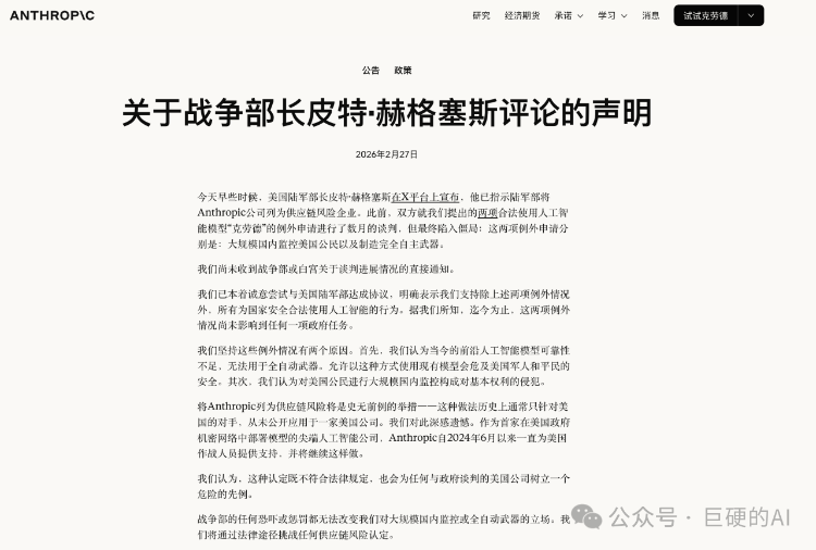 然而,在AI杀掉哈梅内伊的过程中,美国内部爆发了一场关于AI伦理的剧烈冲突。冲突的焦点,是Anthropic公司开发的顶级大模型克劳德(Claude)。
