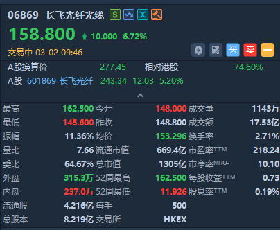 3月2日消息,光通信大牛股长飞光纤光缆盘中逆市拉升涨超6%,年初至今暴涨超200%。
