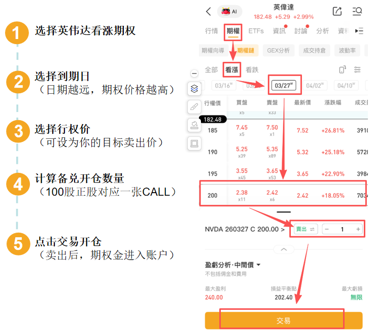 如何在华盛通平台构建专属Covered Call组合呢?以英伟达现价182美元为例,若你当前持有100股;合理备兑开仓,可卖出1张价外200美元、3月27日到期的看涨期权(NVDA_260327_C_200.0 )。