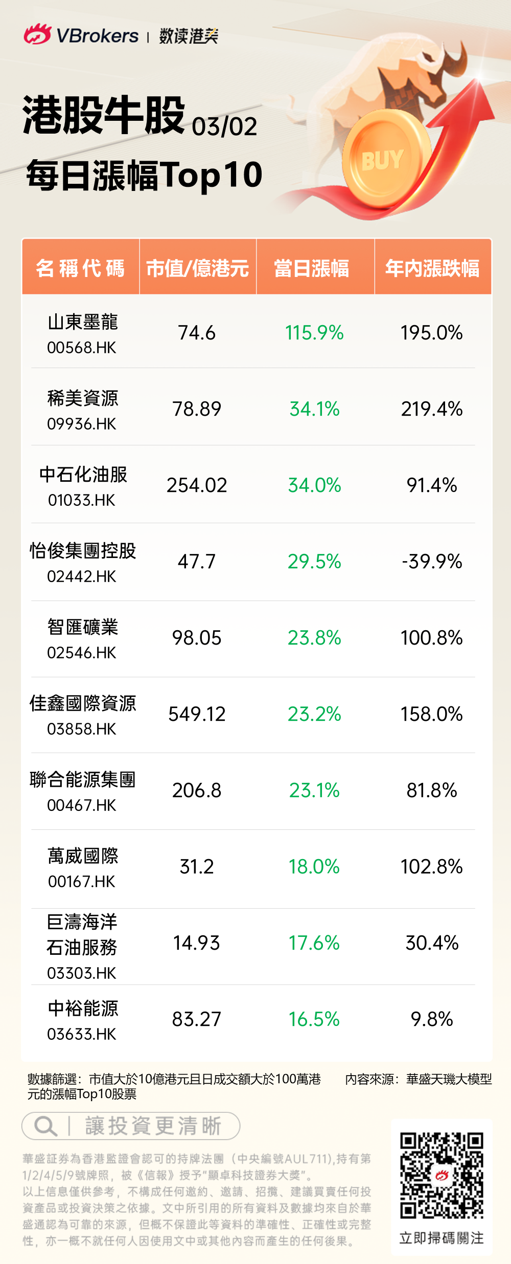 發仔统计了每日港股涨幅Top10,具体名单如下: