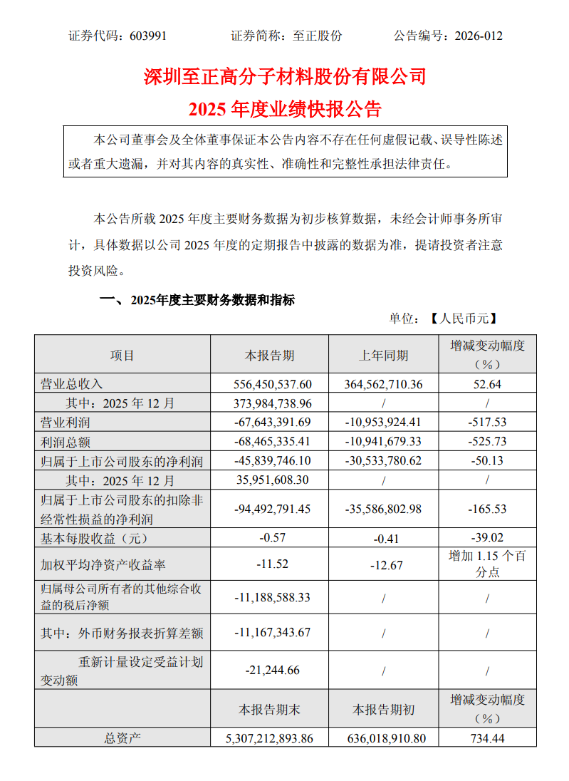 3月3日,至正股份(603991.SH)披露2025年度业绩快报,公司全年营业收入为556,450,537.60元,较上年同期增长52.64%;利润总额为-68,465,335.41元,较上年同期下降525.73%;归属于上市公司股东的净利润为-45,839,746.10元,较上年同期下降50.13%;归属于上市公司股东的扣除非经常性损益的净利润为-94,492,791.45元,较上年同期下降165.53%;基本每股收益为-0.57元,较上年同期下降39.02%。