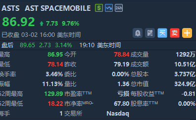 AST SpaceMobile公布了2025年第四季度财报,Q4营收5431万美元,去年同期为192万美元,大幅高于预期的3944万美元,每股收益亏损0.26美元,预期为亏损0.21美元。2025年全年营收将达到7090万美元,主要得益于移动网络运营商合作伙伴和美国政府的推动。截止发稿,ASTS盘后涨超3%。