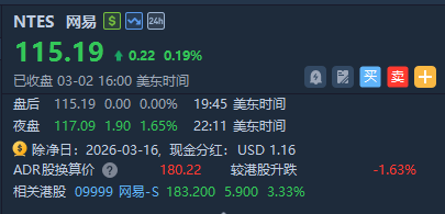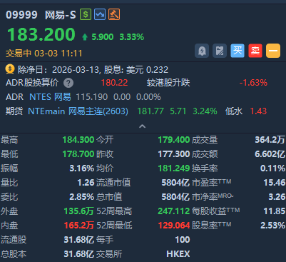 网易-S早盘涨超3%,截至发稿,报183.2港元,成交额约6.6亿港元;美股夜盘涨超1.6%。