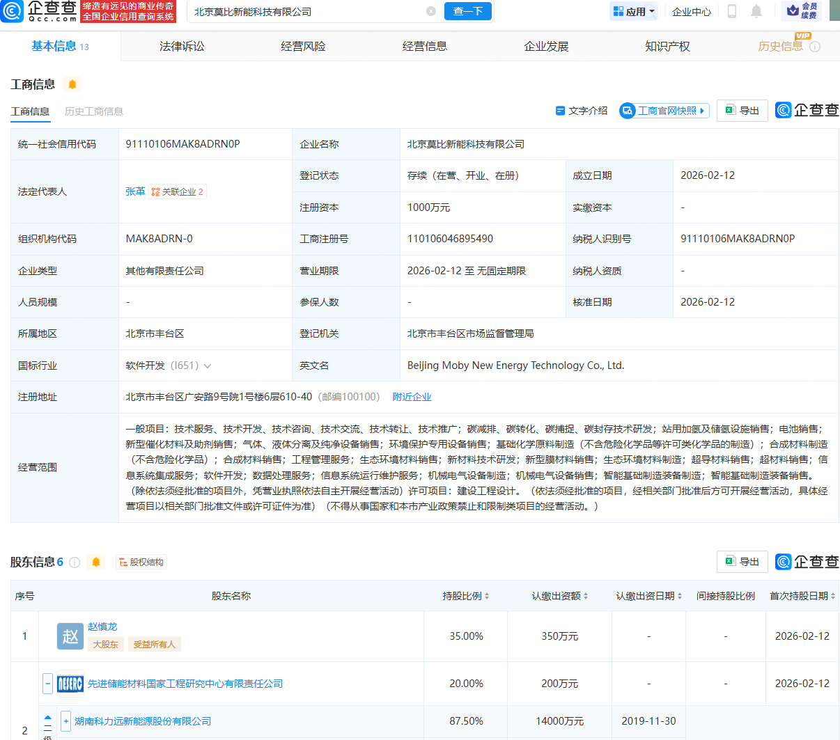 企查查APP显示,近日,北京莫比新能科技有限公司成立,法定代表人为张革,注册资本为1000万元,经营范围包含:站用加氢及储氢设施销售;电池销售;新型催化材料及助剂销售;生态环境材料销售;新材料技术研发等。企查查股权穿透显示,该公司由赵慎龙、科力远(600478.SH)旗下先进储能材料国家工程研究中心有限责任公司等共同持股。