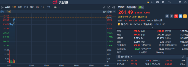华盛资讯3月4日讯,美股存储概念股盘中走强,西部数据、希捷科技大涨超4%,美光科技、Sandisk $SNDK 涨超3%;消息面上,有机构预计Nand闪存一季度涨价90%。