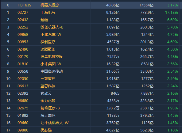 机器人概念股走强,截至发稿,越疆涨超6%,微创机器人涨超5%,速腾聚创、德昌电机控股涨超4%,三花智控涨超2%,地平线机器人、优必选涨超1%。
