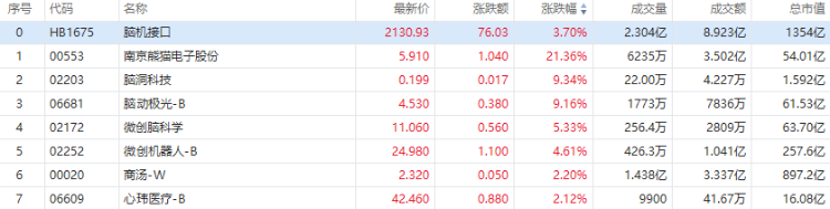 华盛资讯3月5日讯,港股脑机接口概念股短线拉升!南京熊猫电子股份涨超20%,脑动极光-B涨近9%,微创脑科学涨超5%,心玮医疗-B涨超2%。