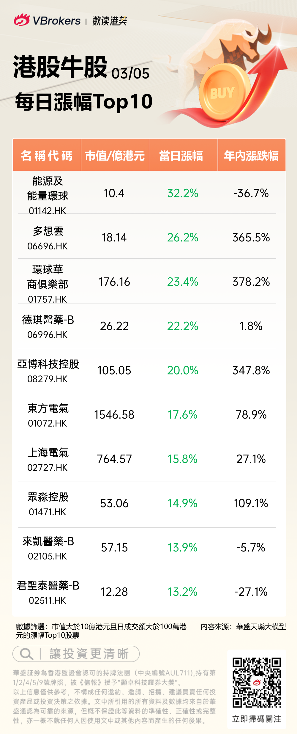 發仔统计了每日港股涨幅Top10,具体名单如下: