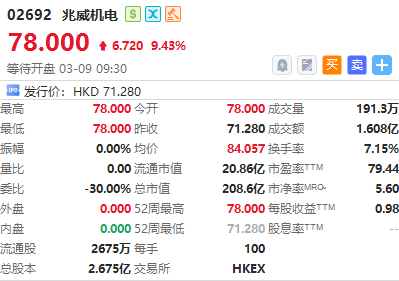华盛资讯03月09日讯,港股兆威机电今日挂牌,截至发稿涨9.43%,报78.00港元/股,中签一手账面浮盈672.0港元,最新总市值超208.64亿港元。该股此前公开发售获1536.76倍认购,一手中签率4.0%。