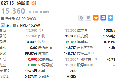 港股埃斯顿今日挂牌,截至发稿涨0.00%,报15.36港元/股,中签一手账面浮盈0.0港元,最新总市值超148.65亿港元。该股此前公开发售获19.67倍认购,一手中签率4.99%。