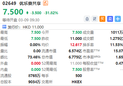 港股优乐赛共享今日挂牌,截至发稿跌31.82%,报7.50港元/股,中签一手账面浮亏1750.0港元,最新总市值超6.78亿港元。该股此前公开发售获5297.23倍认购,一手中签率0.04%。