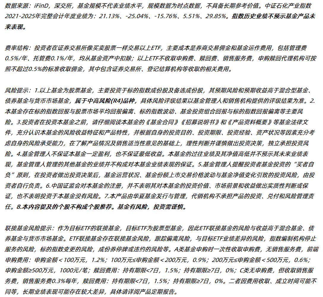 石化ETF(159731)及其联接基金(017855/017856)跟踪中证石化产业指数,聚焦“大能源”安全逻辑。不仅能分享下游化工品的利润修复,此外通过高配“三桶油”等炼化龙头,锁定能源上游资源价值,在油价上行周期具备更强的业绩韧性。