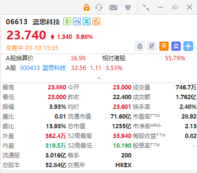 蓝思科技涨超6%,截至发稿,涨5.98%,报23.74港元,成交额1.762亿港元。
