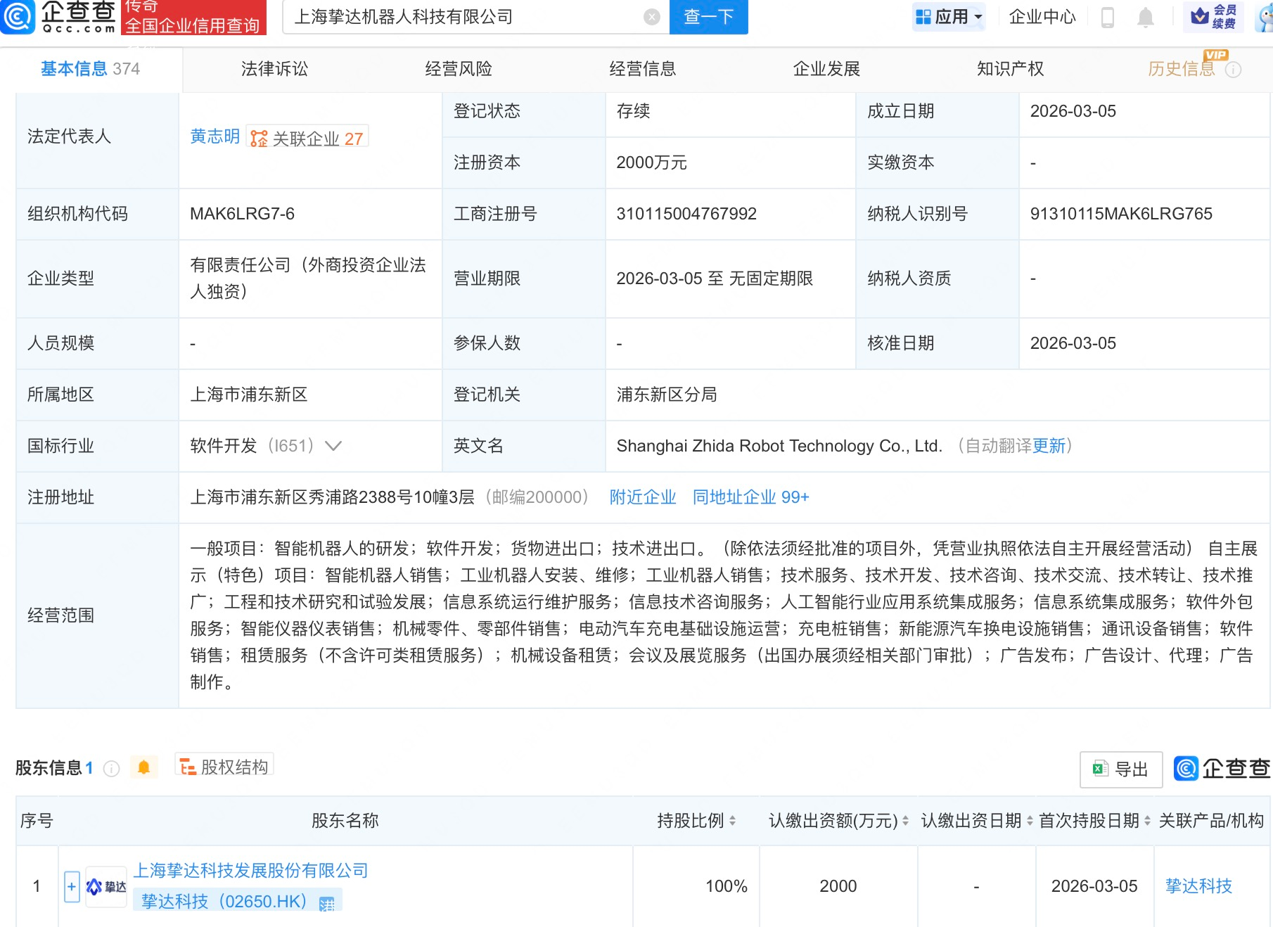 企查查APP显示,近日,上海挚达机器人科技有限公司成立,法定代表人为黄志明,注册资本2000万元,经营范围包括智能机器人的研发、智能机器人销售、人工智能行业应用系统集成服务等。企查查股权穿透显示,该公司由挚达科技(02650.HK)全资持股。