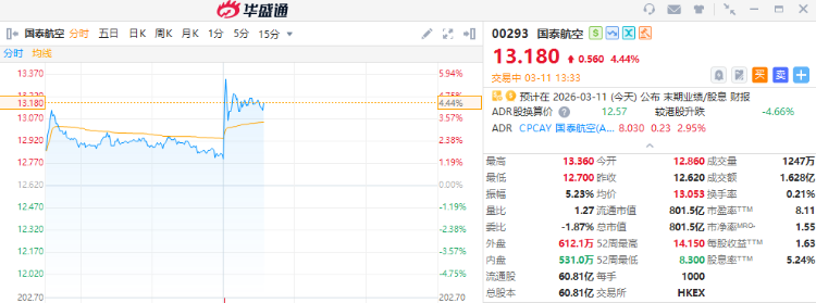 华盛资讯3月11日讯,国泰航空午后拉涨超4%,公司2025全年营收1167.66亿港元,同比增长11.9%,归母净利润108.28亿港元,同比增长9.5%。