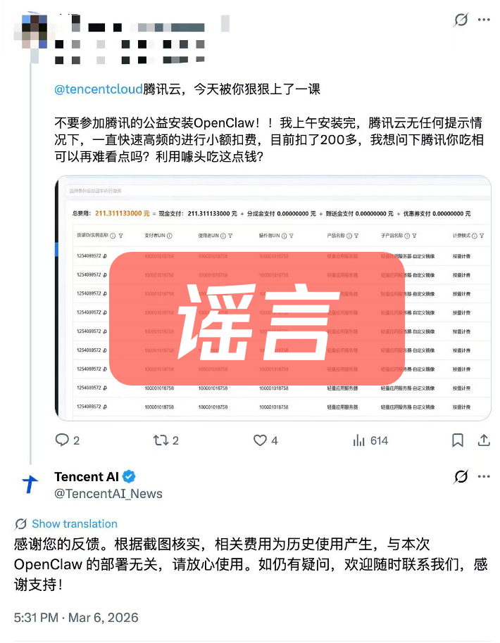 3月11日,腾讯云发文回应与OpenClaw及腾讯“龙虾”相关的安全问题。就OpenClaw是否会“疯狂”地扣用户的钱,腾讯云提到,社交平台上流传着一张截图,显示一名用户在腾讯云公益装机活动上安装OpenClaw之后出现高额费用“偷跑”,累计200多元。腾讯云回应称,经后台排查及核实,这200多元是这名用户此前的历史模型调用费用。“OpenClaw安装本身免费,但如果使用过程中调用大模型,就会产生token费用,目前基本所有Agent工具都是类似情况。”腾讯云称。
