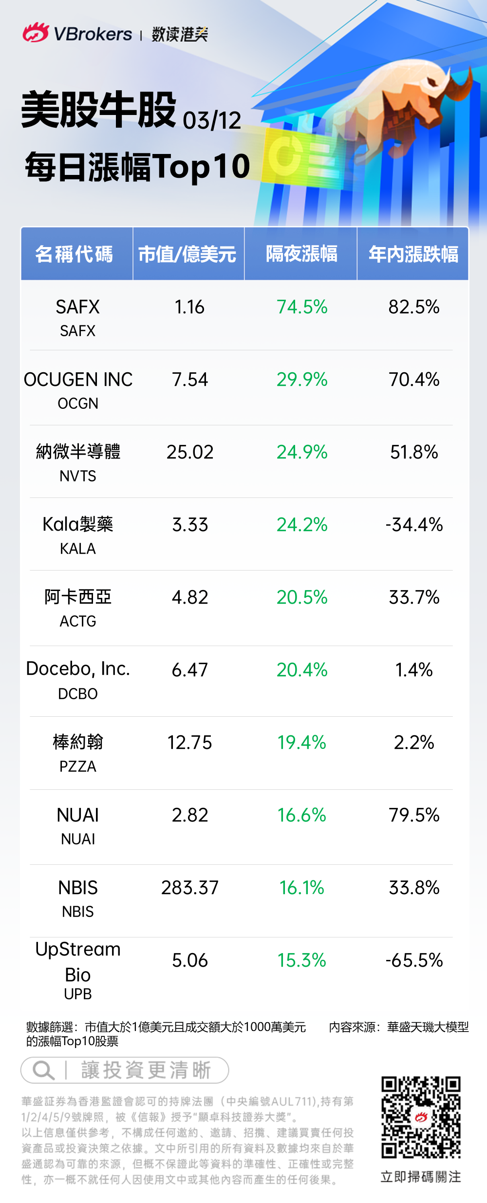 發仔梳理了每日美股涨幅Top10榜单,供投资者参考。以下为隔夜美股涨幅靠前的个股: