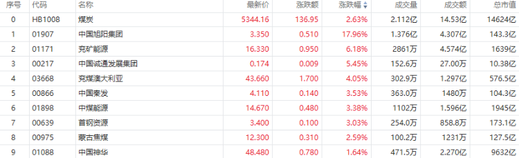 煤炭股再度走高!中国旭阳集团大涨近18%,兖矿能源涨超6%,兖煤澳大利亚涨超4%,中煤能源涨超3%,中国神华涨超1.5%。