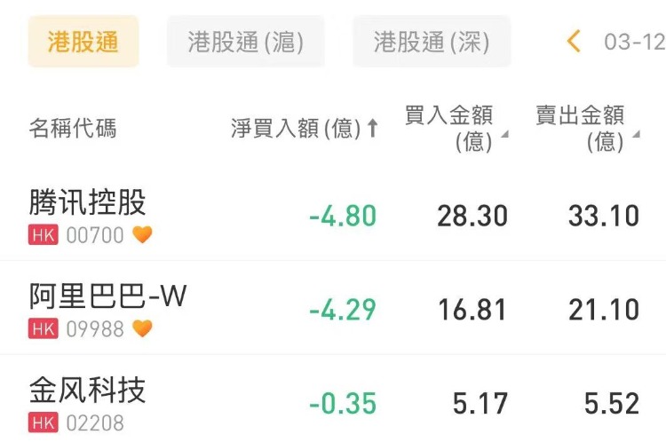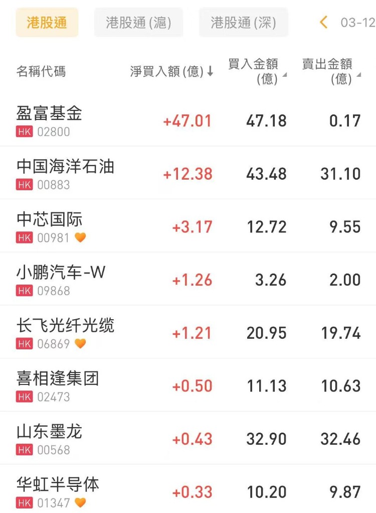 3月12日港股市场,北水成交净买入112.83亿港元。其中港股通(沪)成交净买入61.5亿港元,港股通(深)成交净买入51.32亿港元。